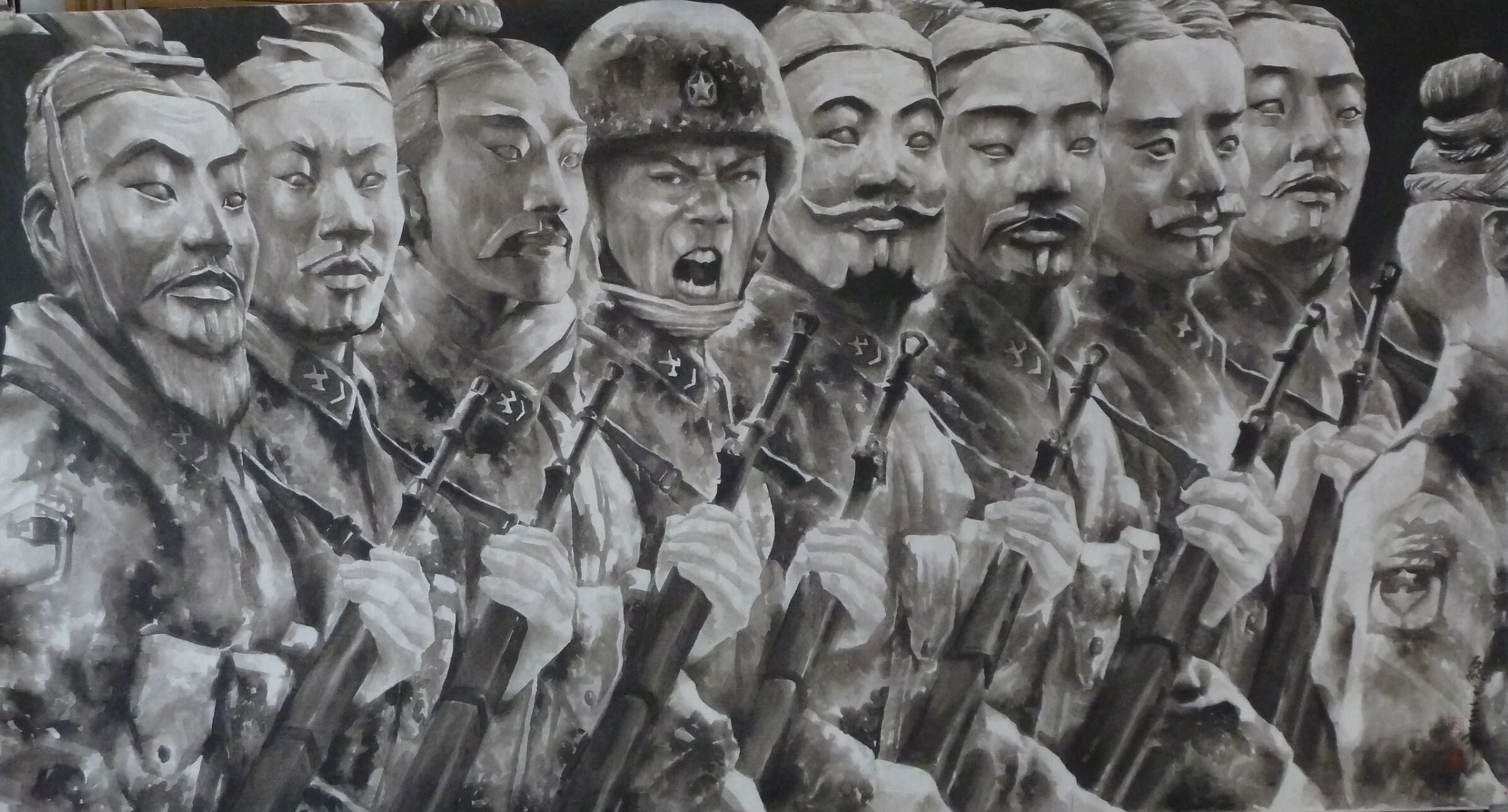 Here Qu Lei Lei was examining propaganda posters through a much more contemporary vision. He put his mind to blending the visual imagery of these social ideologies from recent history with similar art forms of the past but through the lens of his own modern awareness.