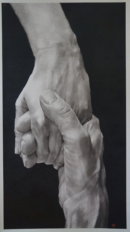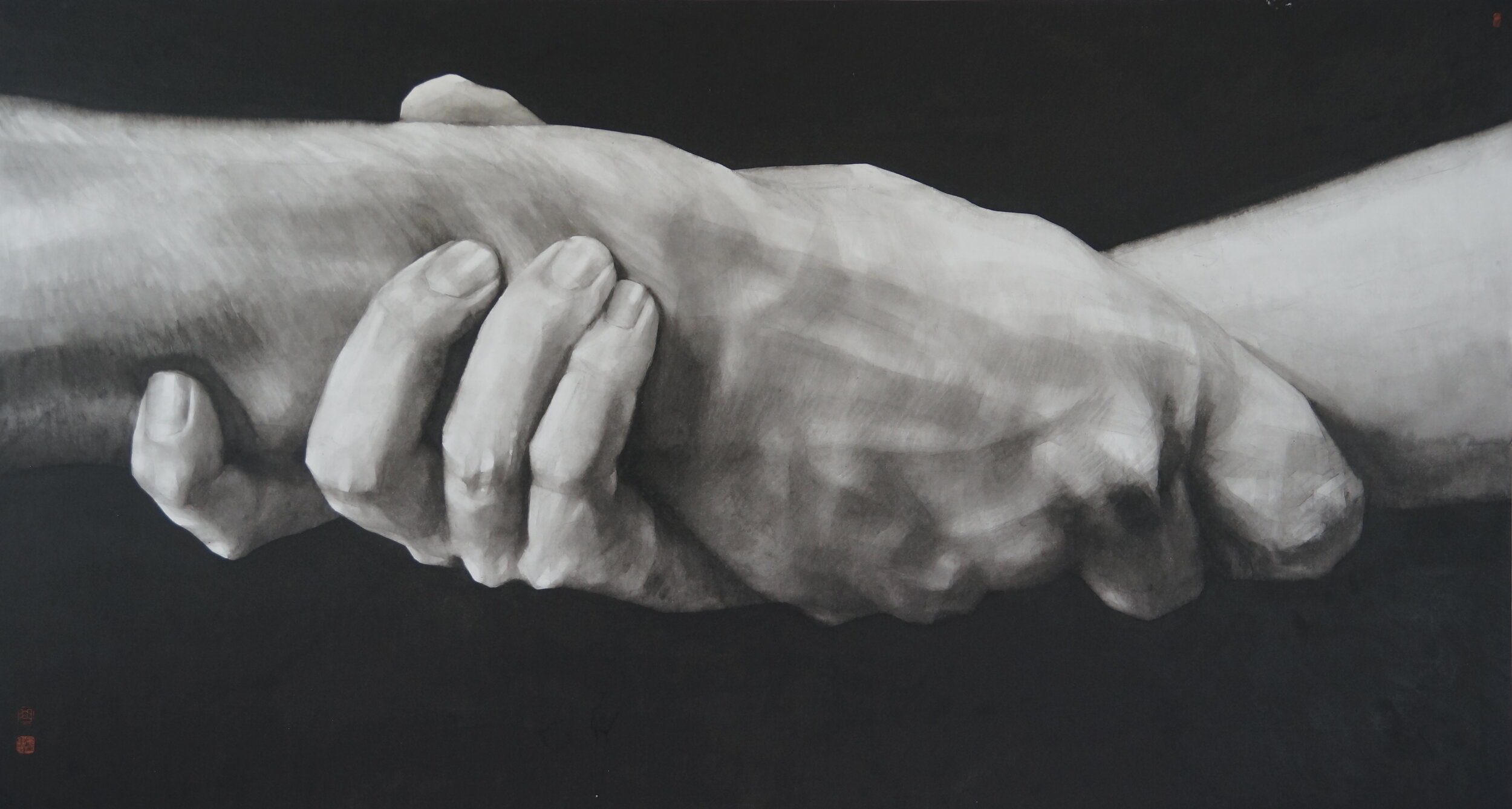 ‘As the twentieth century drew to a close Qu Lei Lei started his ‘Facing the New Century’ series, attempting to express universal sentiment with all mankind. He came up with the idea of using simple pictures of the human hand that would transcend class, race and gender. But the paintings were more than straightforward visual images, they represented an urgent proclamation to humankind to confront the opportunities, challenges and crises of the world’.